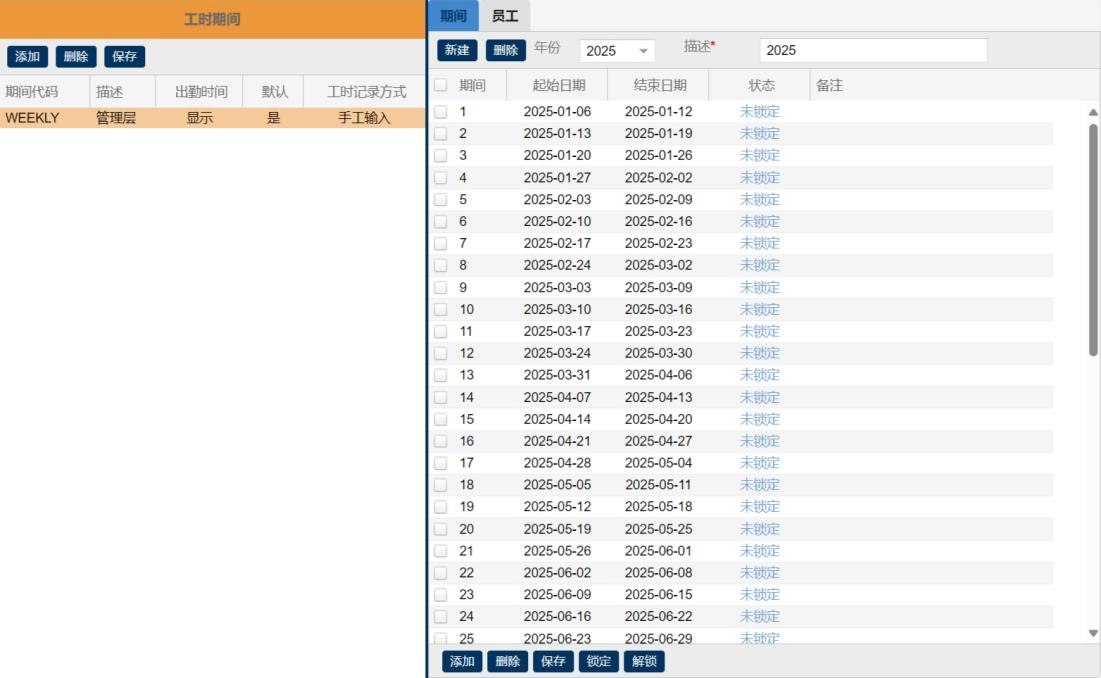 注:工时期间维护界面分左右两侧,左侧是工时期间代码列表框,列示所有工时期间代码。右侧是工时填报期间明细框,列示所选工时期间在特定年度的填报期间划分。