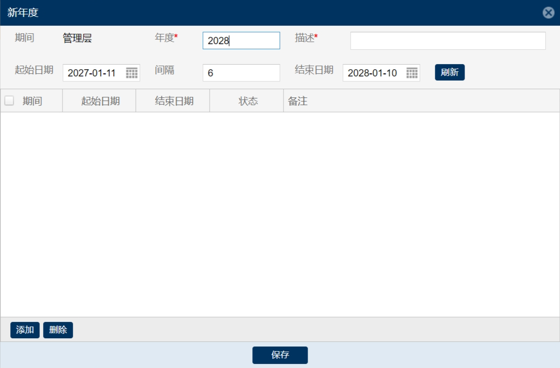 16. 点击保存按钮,保存新建年度的工时填报期间划分。