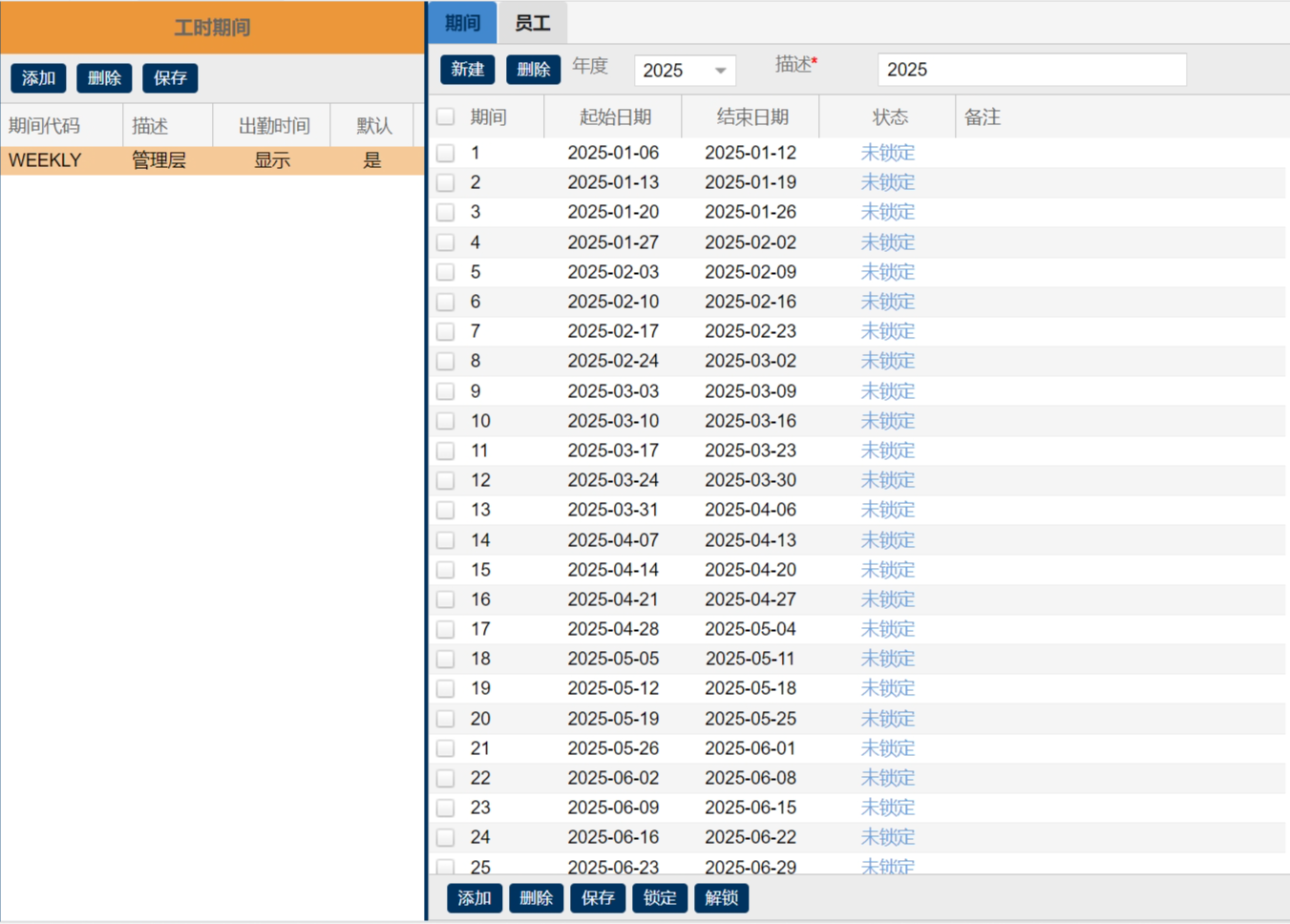 3. 在工时期间维护界面的左侧,选择需要锁定的工时期间代码。工时期间维护界面的右侧显示工时填报期间列表框,如下图所示: