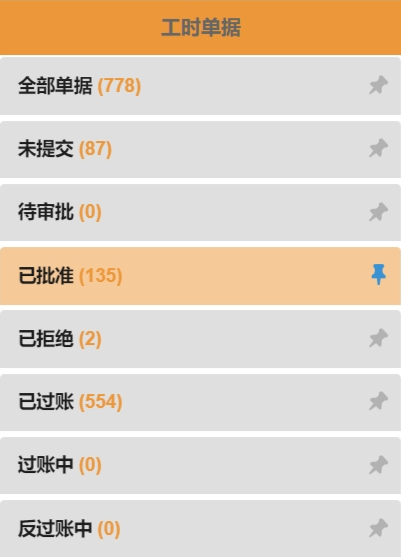⚫ 按单据审批:系统按工时单据状态分组显示工时单据;