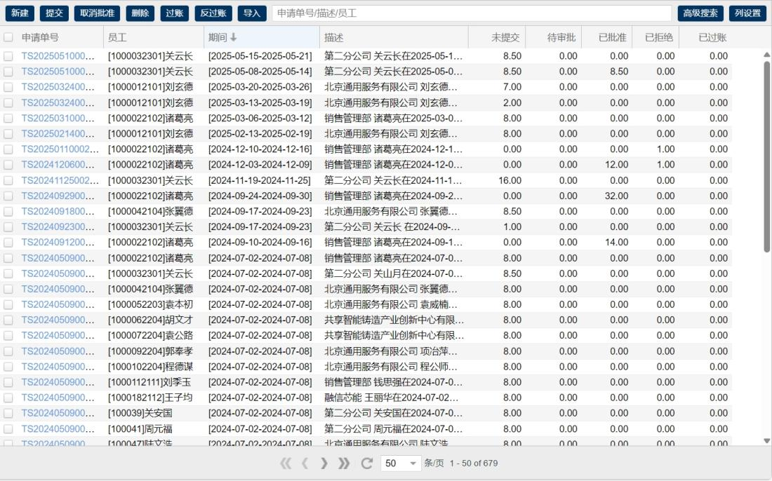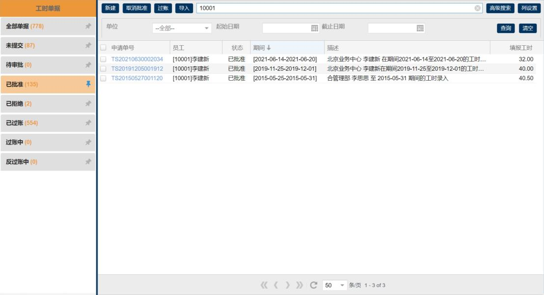 全部单据是系统默认查询栏,显示全部员工填报的全部工时单。此外,系统按工时单状态提供多个查询栏目,包括:未提交、待审批、已批准、已拒绝、已过账、过账中等。