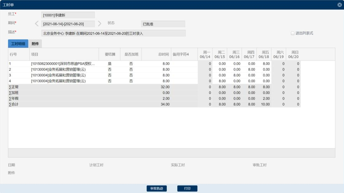 注:当工时单使用进出列表样式显示工时记录,工时单明细表每行就是一个工时记录。用户可以查看工时记录的状态、日期、项目、任务、起止时间、实际工时、出勤小时、上班时点、下班时点、备注等。点击状态链接可以显示工时记录的审批轨迹。
