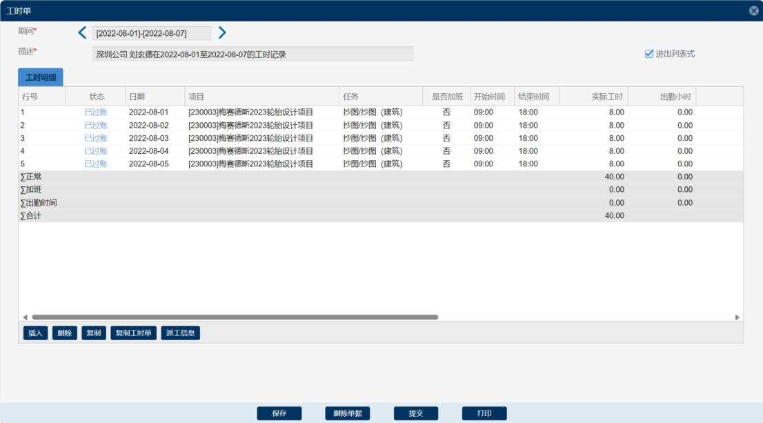 注:工时单界面可以按交叉表格式或进出列表格式显示工时记录,工时单包含的工时记录被同时提交给审批人员进行审核。