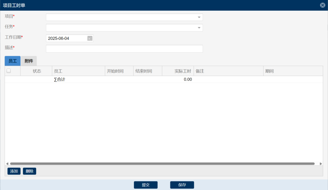 注:如果系统按记录审批工时,项目工时单界面显示提交和保存按钮,否则,项目工时单界面仅显示保存按钮。