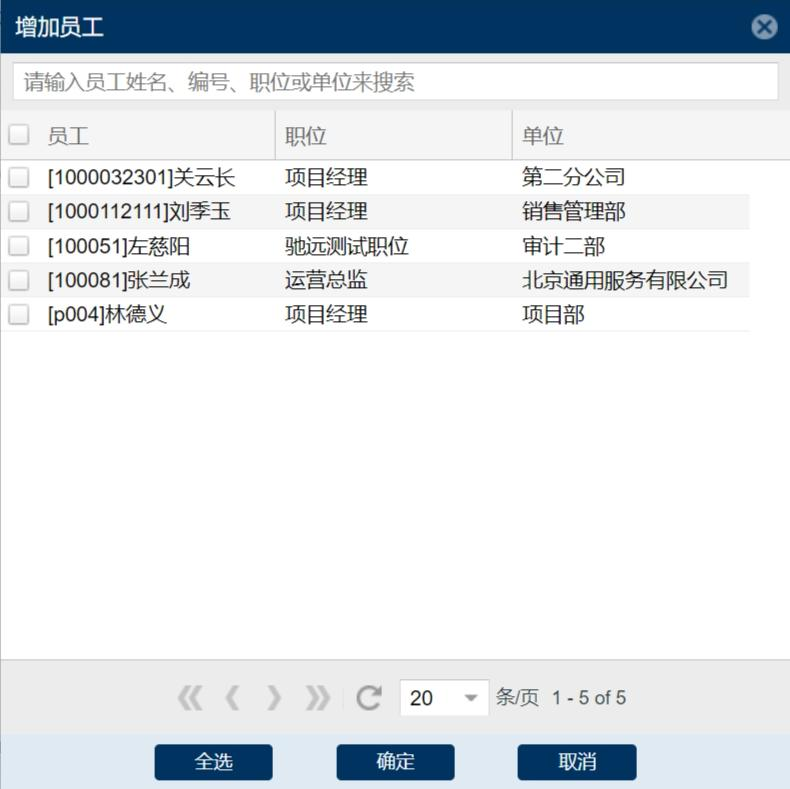 8. 点击明细表的添加按钮,显示项目员工筛选框,如下图所示: