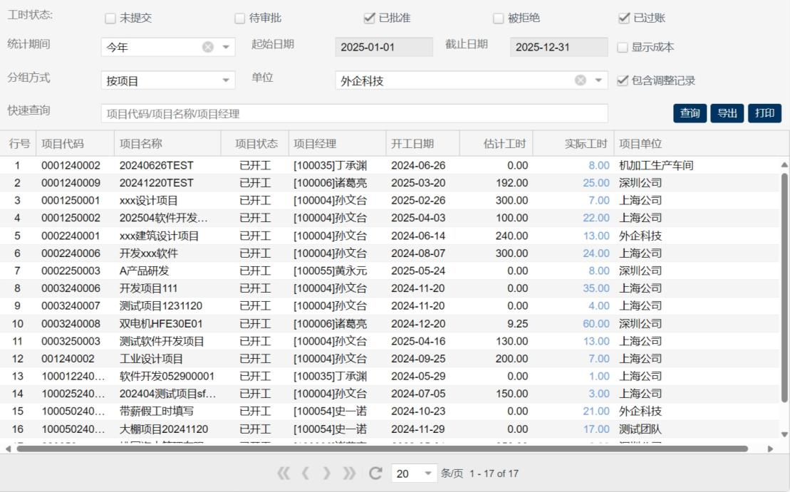 10. 点击查询按钮,根据所选统计或查询条件显示项目工时统计。