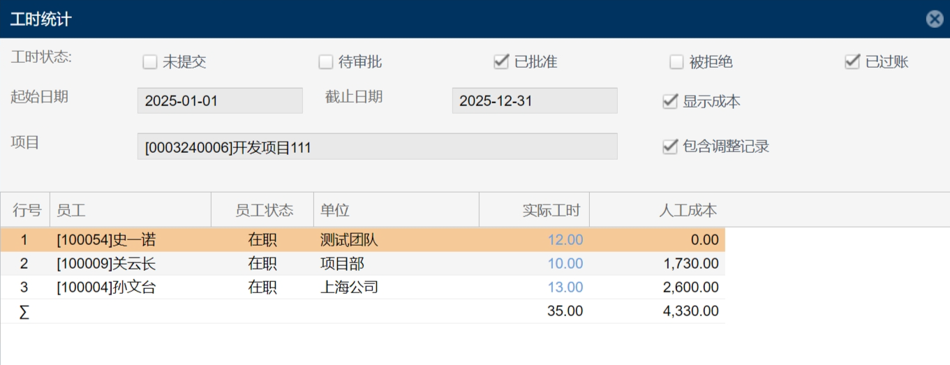 注:项目工时的人员分布界面显示相关员工在所选项目填报的实际工时和人工成本。