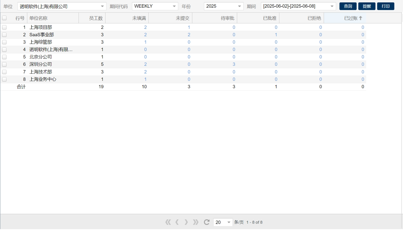 7. 点击查询按钮,根据所选条件显示各单位员工工时单的填报和审批情况。