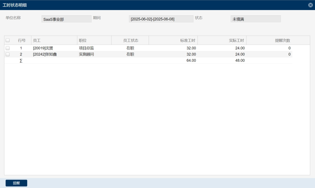 注:工时单未填满的人员列表逐行显示员工在指定期间的标准工时和实际工时。勾选一个或全部员工,再点击提醒按钮,对所选员工发送工时填报提醒。