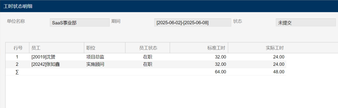当系统按单据审批工时,工时状态菜单实时统计并显示各部门员工,在指定工时期间的工时单填报及审批情况。