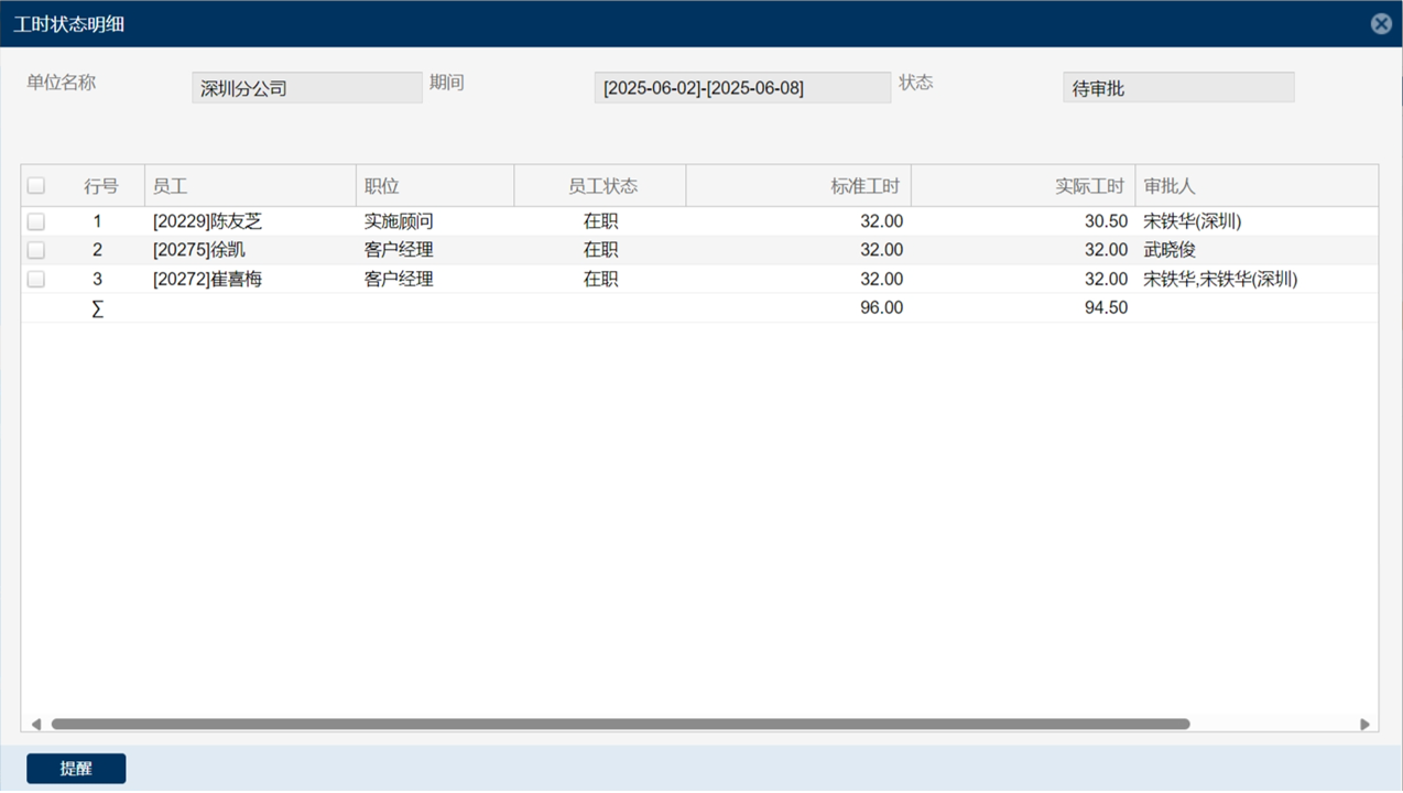 注:待审批员工列表逐行显示待审批工时单的标准工时、实际工时,以及下一位审批人。勾选一个或全部工时单,再点击提醒按钮,对相关审批人发送工时审批提醒。