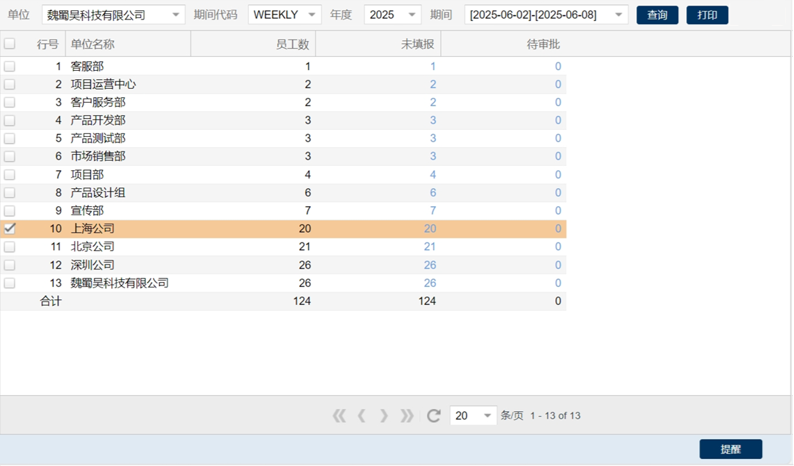 7. 点击查询按钮,根据所选条件显示各单位工时记录未填报、待审批的员工人数。