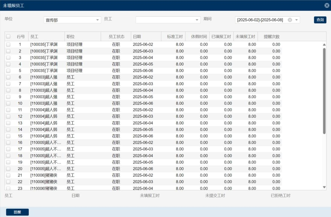 注:未填报工时记录明细列表逐行显示各位员工,在指定工时填报期间每天的标准工时、休假小时、已填报工时、未填报工时。勾选一个或全部待填报的工时记录,再点击提醒按钮,对相关员工发送工时记录填报提醒。