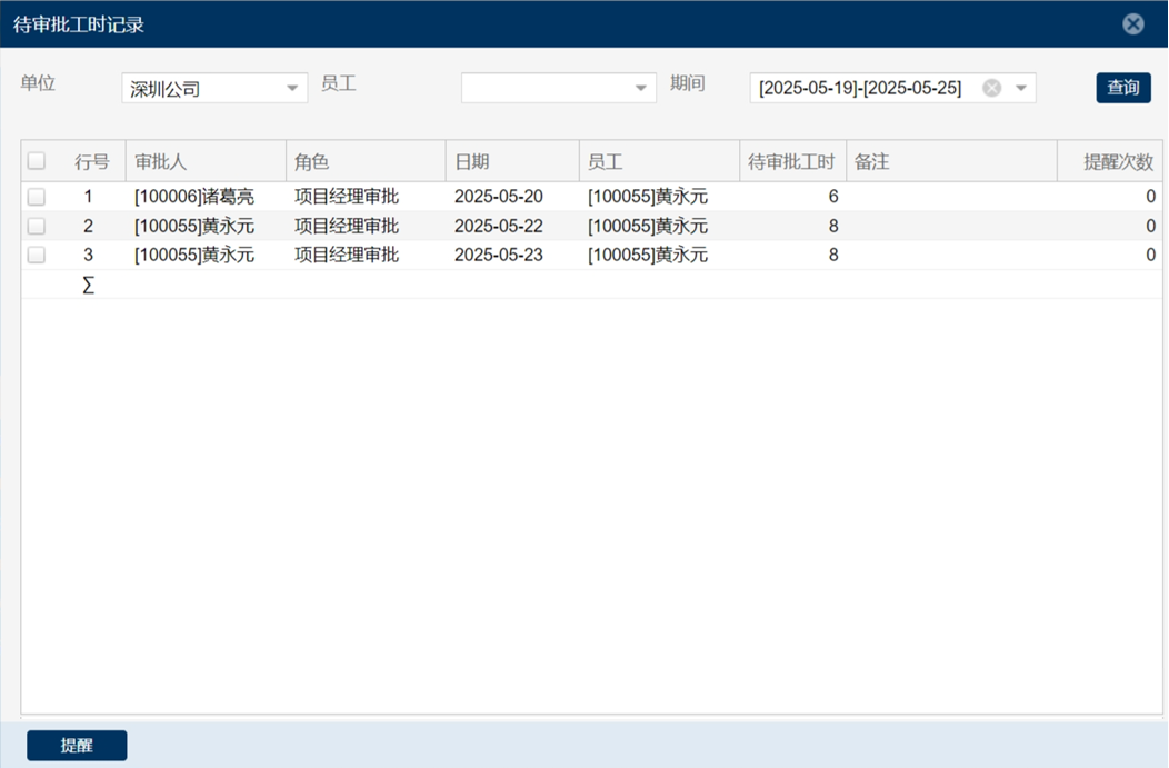 注:待审批工时记录明细列表逐行显示需要审核的工时记录。勾选一个或全部工时记录,再点击提醒按钮,对相关审批人发送工时记录审批提醒。