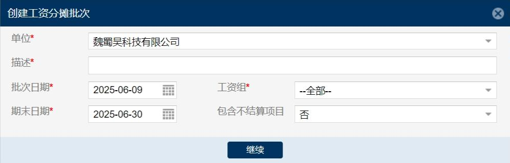 3. 点击创建按钮,显示工资分摊批次创建界面,如下图所示: