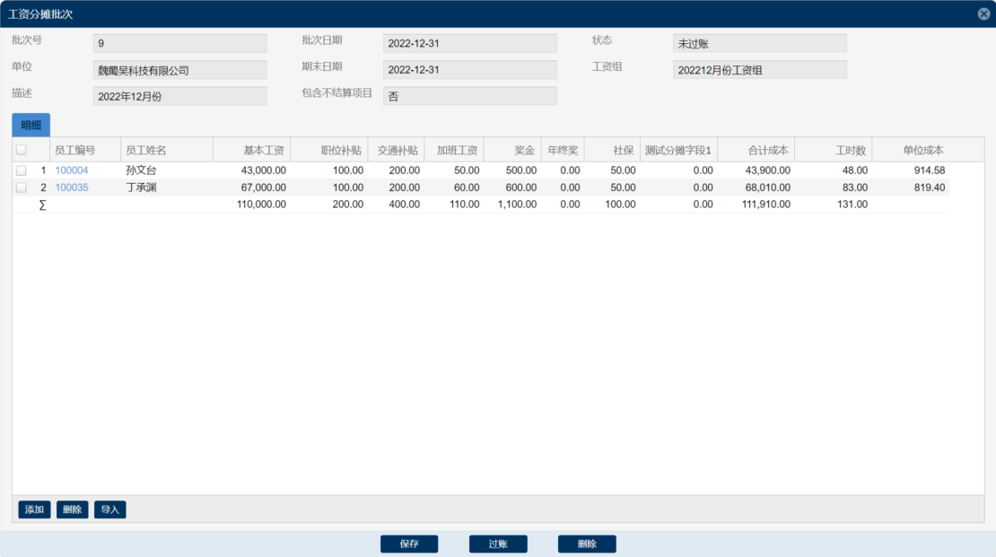 注:系统根据员工在计提期间的薪资福利和工时记录,逐行显示每个员工的薪资福利成本、合计成本和工时数,并根据合计成本和工时数计算员工的实际单位成本。薪资福利项可粗可细,由用户根据需要基于工资组设置。