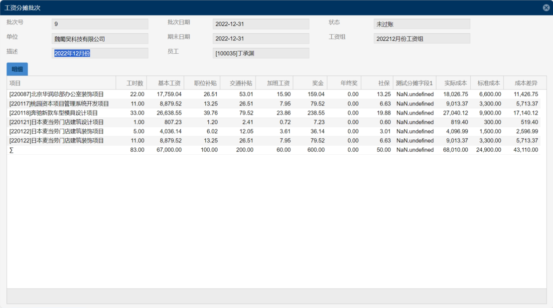 注:员工薪资福利分摊明细表逐行显示相关项目的工时数,以及按项目工时分摊到每个项目的薪资福利成本。项目工时数乘于员工的标准单位成本等于项目的标准成本,如果员工的实际成本大于标准成本,则员工在计提期间的实际工时小于计划工时。
